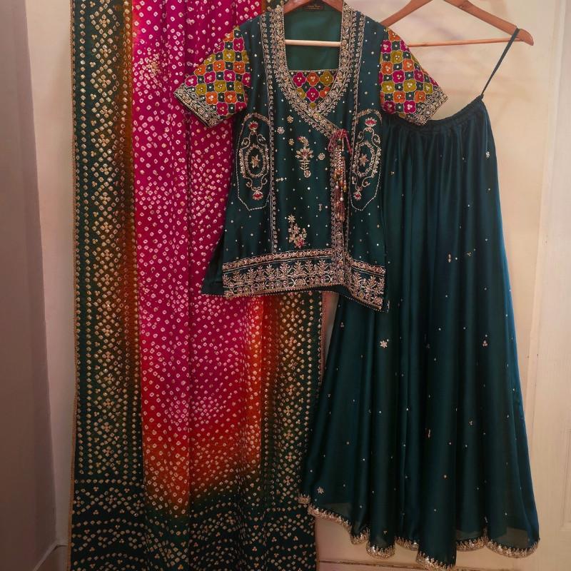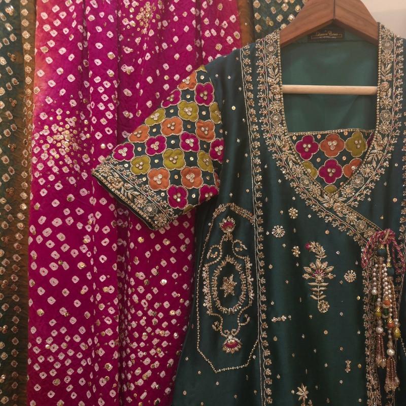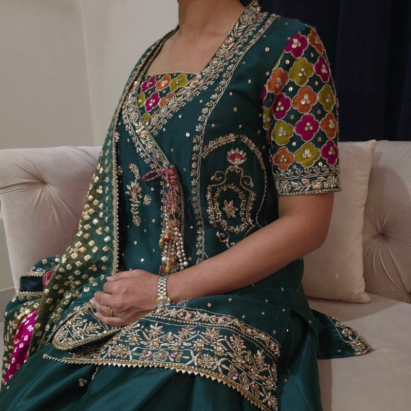 Be the center of attention in this deep Emerald Green ensemble. This masterpiece combines the rich glow of *Pure Sheesha Silk* with the traditional charm of a *Pure Silk Chunri* dupatta, creating a look that is both regal and refined.